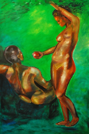 Adam krijgt fruit aangeboden door Eva tussen het paradijselijk groen. Hij kan kiezen. Adam's keuze !